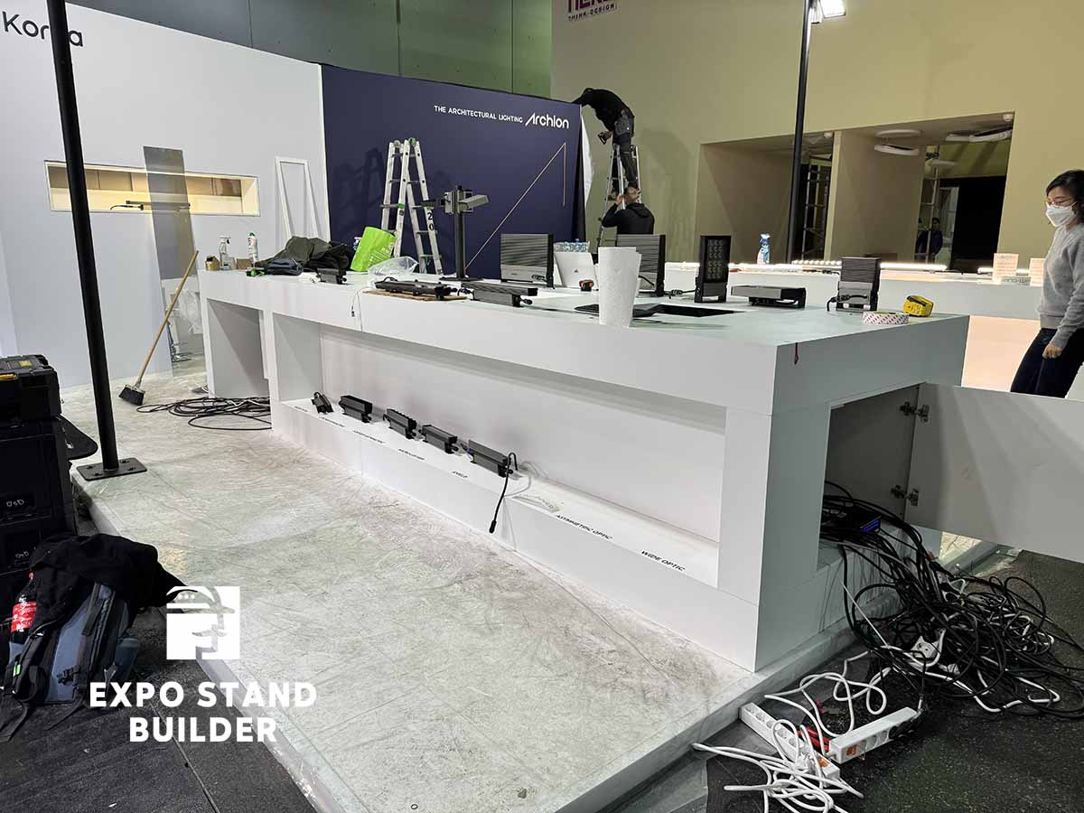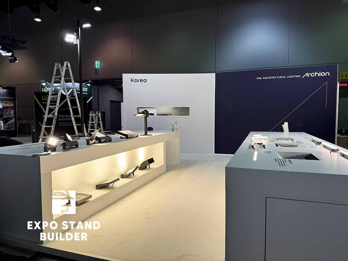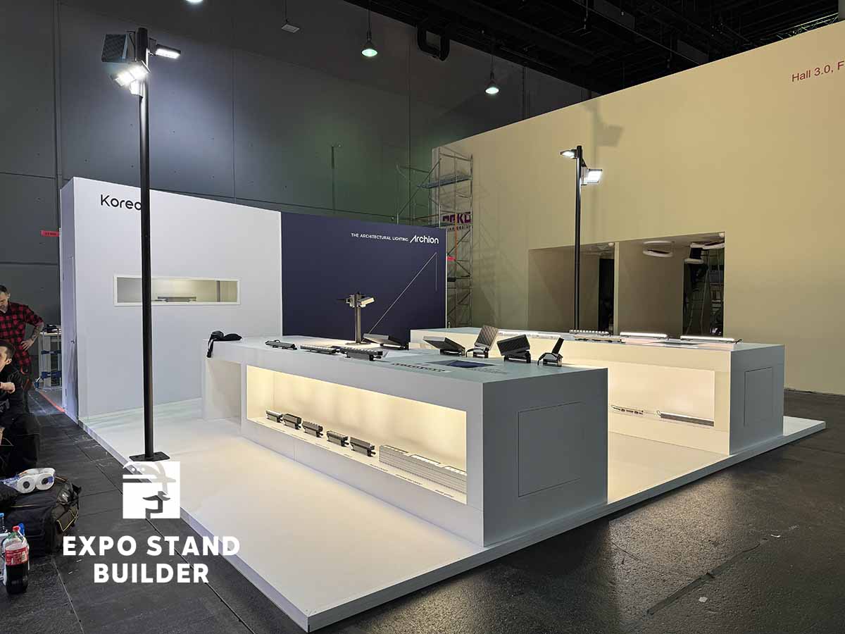 Wir präsentieren Ihnen einen individuellen Messestand für ein koreanisches Unternehmen auf der Light + Building in der Messe Frankfurt. Der Stand besteht aus Ausstellungsbereichen für die Produkte des Kunden. Das Design des Messestandes wurde vom Kunden entworfen, unser Team hat die Umsetzung übernommen. Die Möbel und Wände sind vollständig maßgefertigt. Außerdem verfügt der Stand über einen kleinen Lagerraum. Um einen individuellen Messestand in Frankfurt zu bestellen, hinterlassen Sie bitte eine Anfrage auf unserer Website.