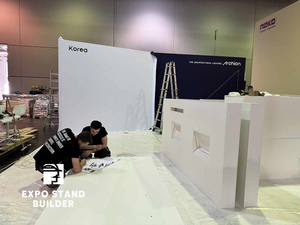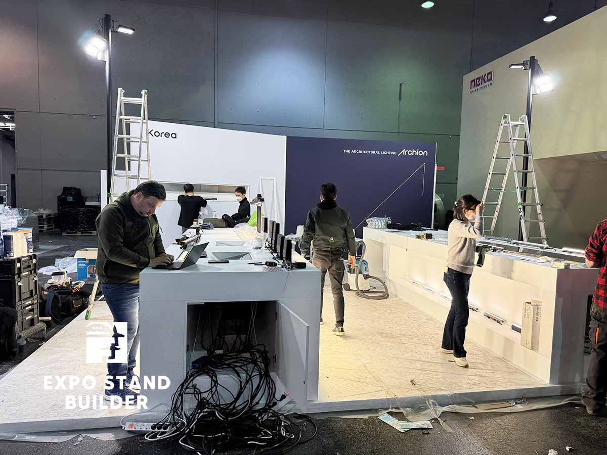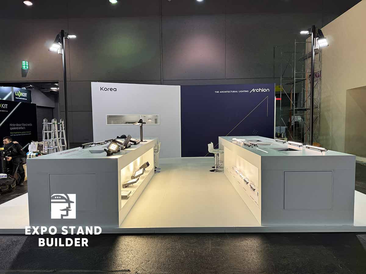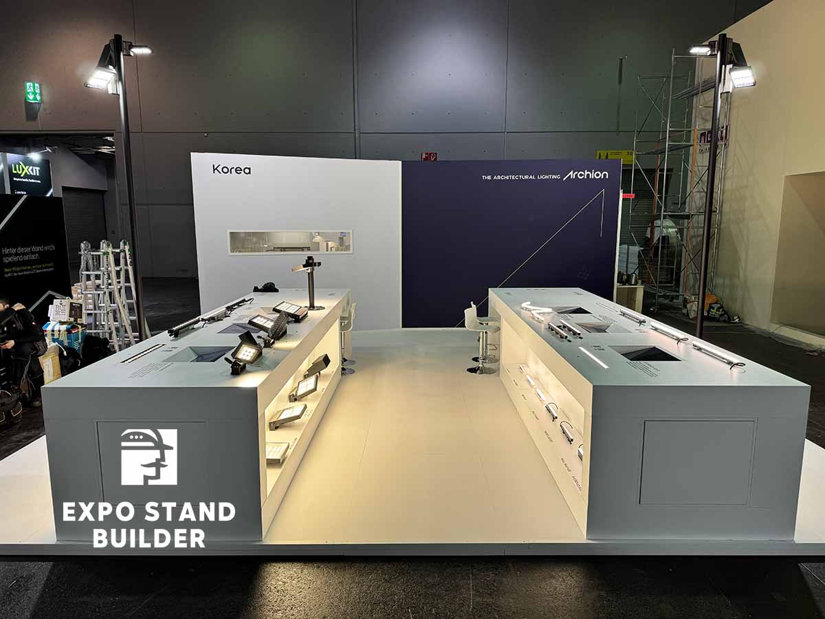 Wir präsentieren Ihnen einen individuellen Messestand für ein koreanisches Unternehmen auf der Light + Building in der Messe Frankfurt. Der Stand besteht aus Ausstellungsbereichen für die Produkte des Kunden. Das Design des Messestandes wurde vom Kunden entworfen, unser Team hat die Umsetzung übernommen. Die Möbel und Wände sind vollständig maßgefertigt. Außerdem verfügt der Stand über einen kleinen Lagerraum. Um einen individuellen Messestand in Frankfurt zu bestellen, hinterlassen Sie bitte eine Anfrage auf unserer Website.