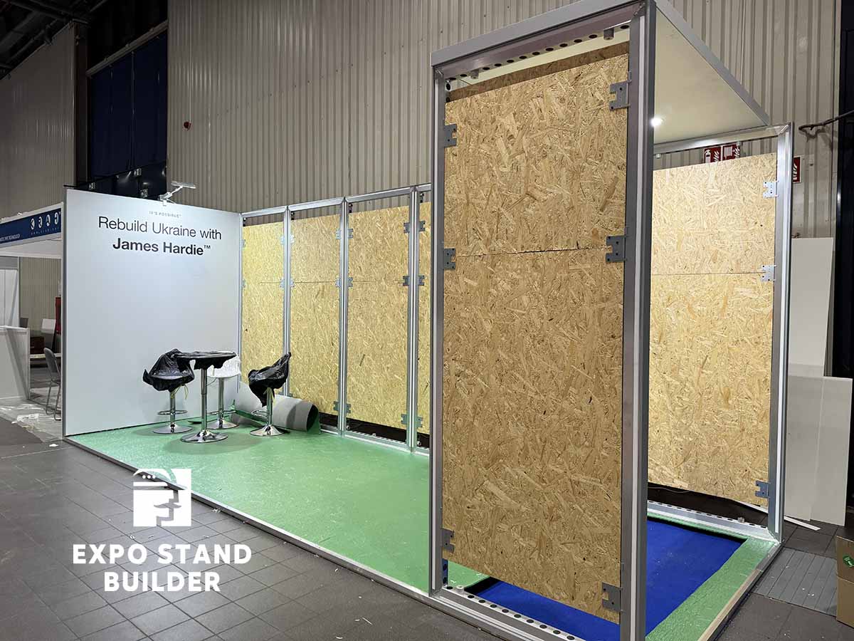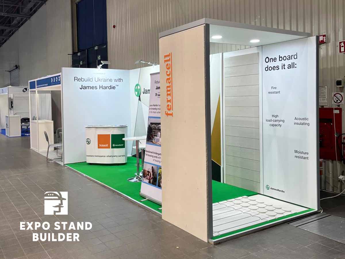Modularer Messestand auf der jährlichen Messe Rebuild Ukraine in Warschau für das Unternehmen James Hardie. Auf dem Messestand präsentierte das Unternehmen Muster seiner Produkte und Lösungen für Fachleute aus der Baubranche. Damit sich der Stand von den Shell-Scheme-Konstruktionen abhebt, haben wir ein niedriges Podium verwendet. Wenn Sie Messestände beliebiger Komplexität in Warschau benötigen, wenden Sie sich an uns!