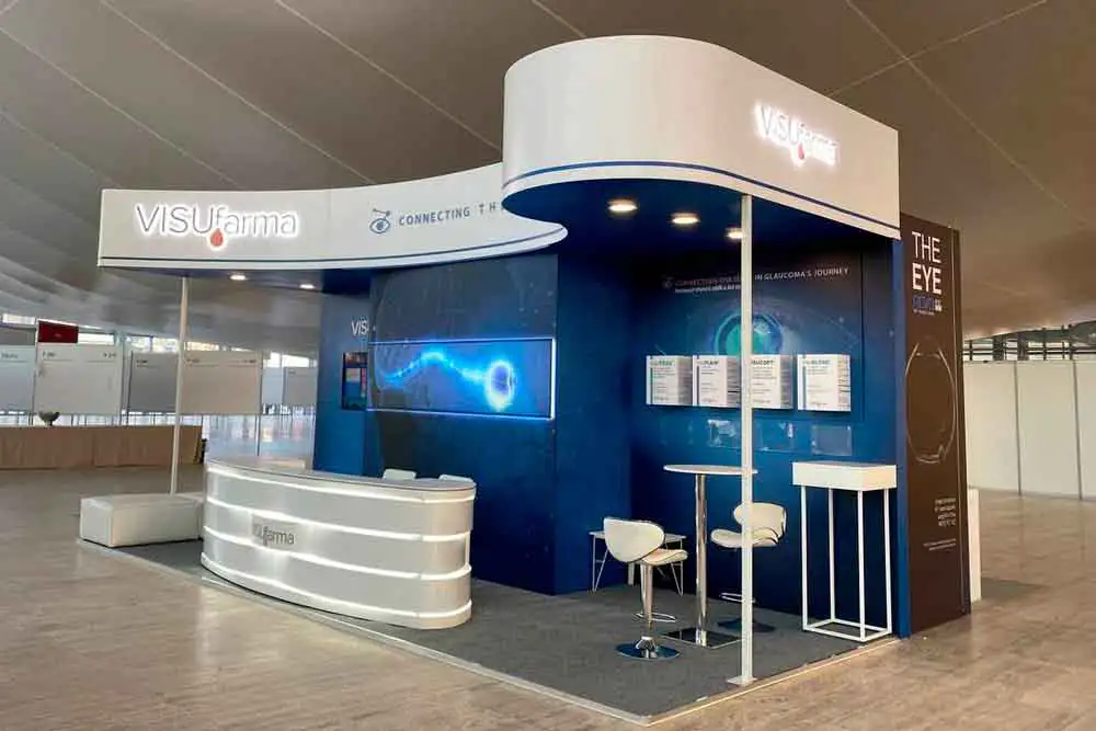 Wir bauten einen kleinen Messestand in Italien. Das attraktive Design des Standes wurde für die Firma VISUFARMA entwickelt. Das Unternehmen nahm am WORLD GLAUCOMA CONGRESS teil. Es war ein sehr interessantes Projekt, das wir in kürzester Zeit realisiert haben. Im Stand wurde hinter der Rezeption ein Wirtschaftsraum eingerichtet. Standgröße 21 m².