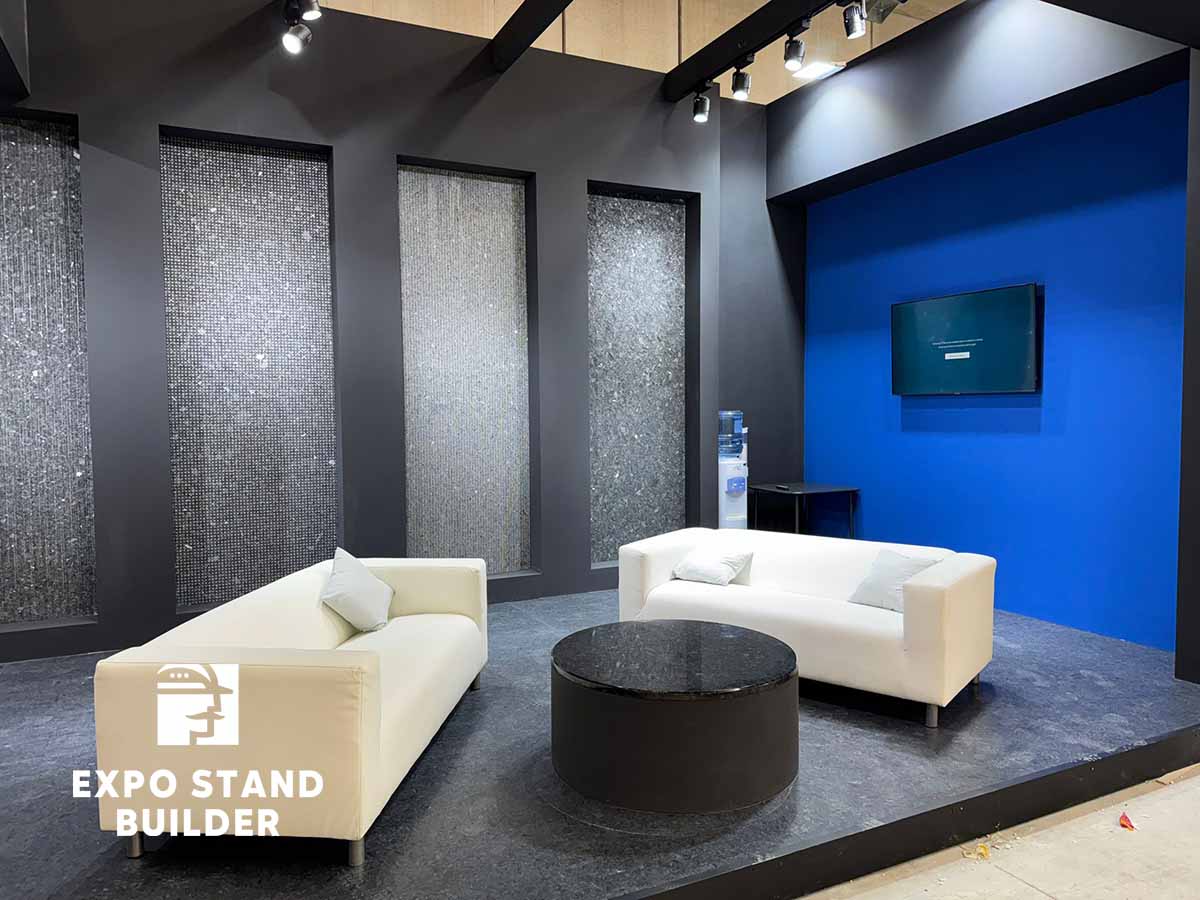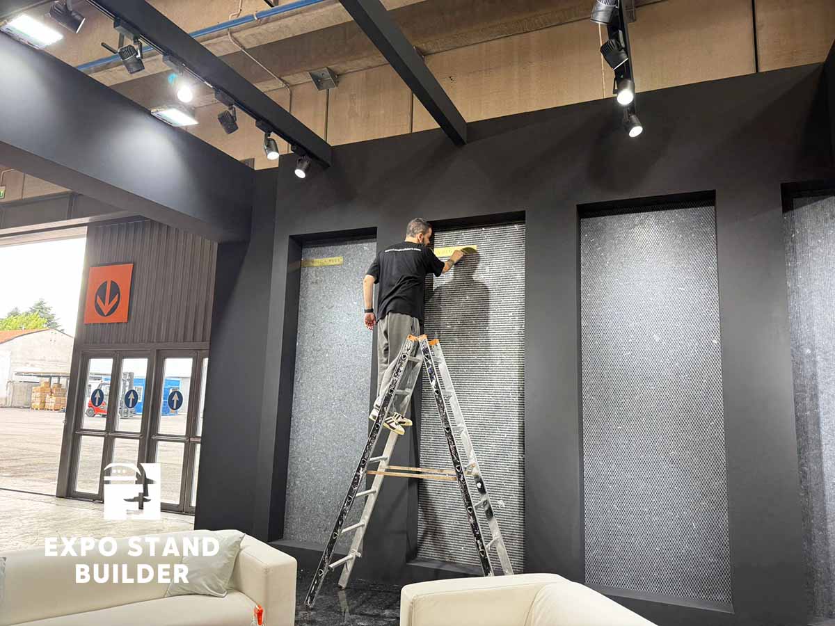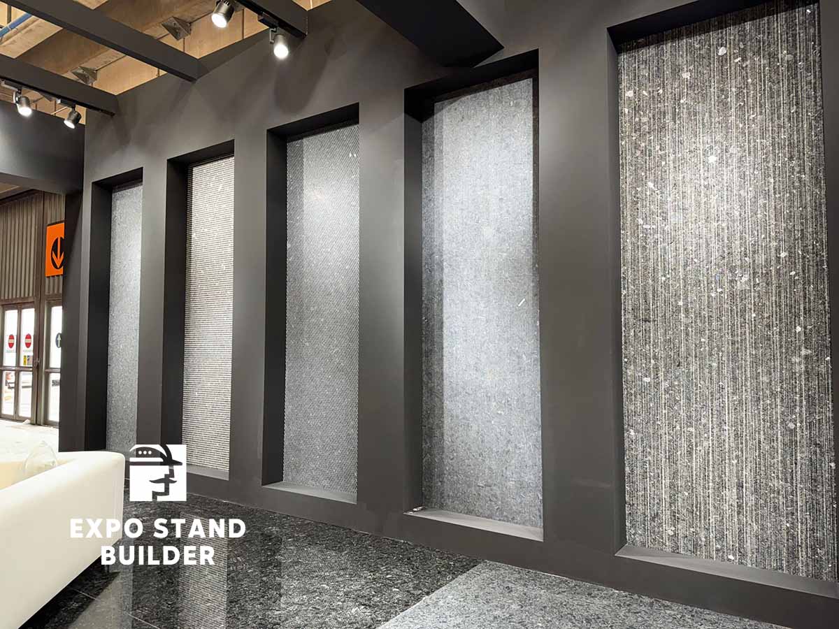 Ściana demonstracyjna z produktami naszego klienta. Stoisko targowe w Weronie na targach MARMOMAC o łącznej powierzchni 84 m². Stoisko podzielone jest na strefy negocjacyjne z recepcją i elementem dekoracyjnym pośrodku.