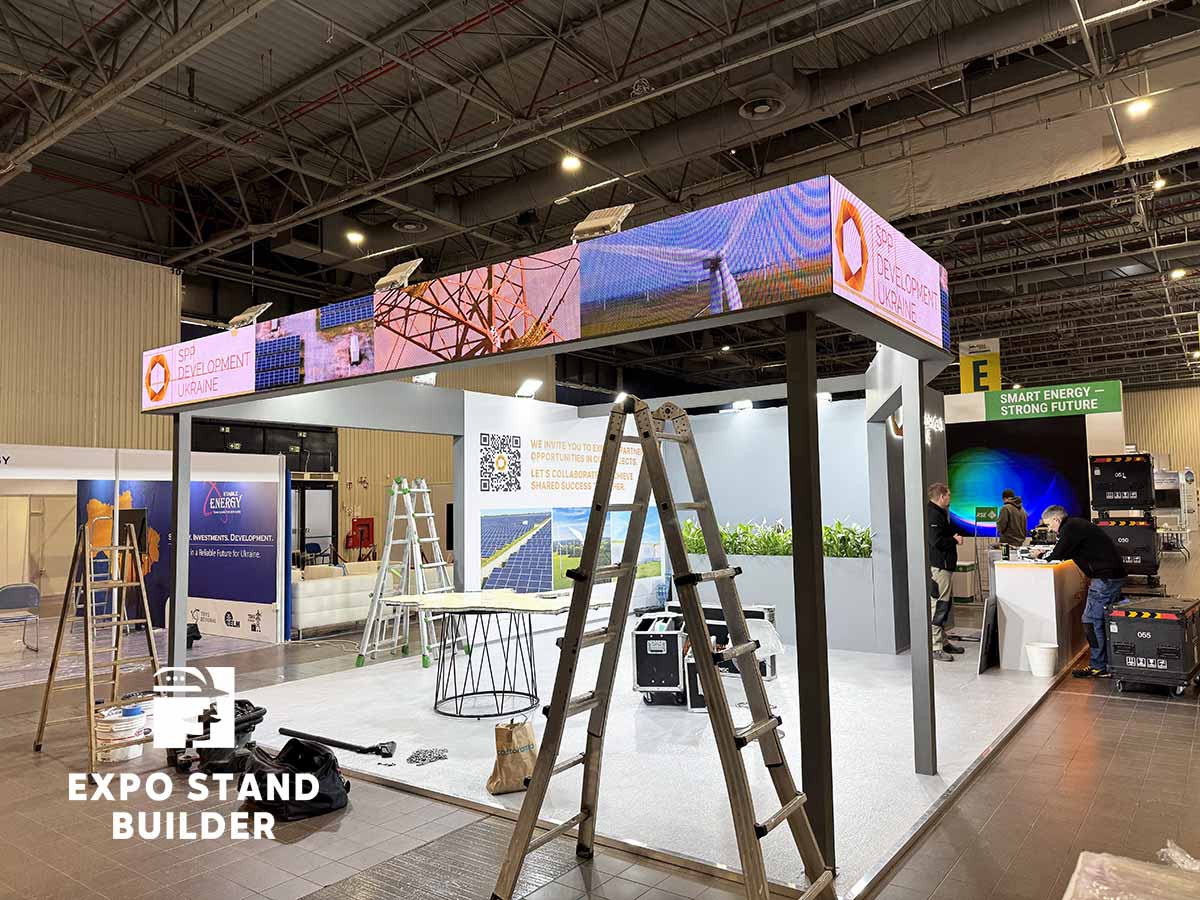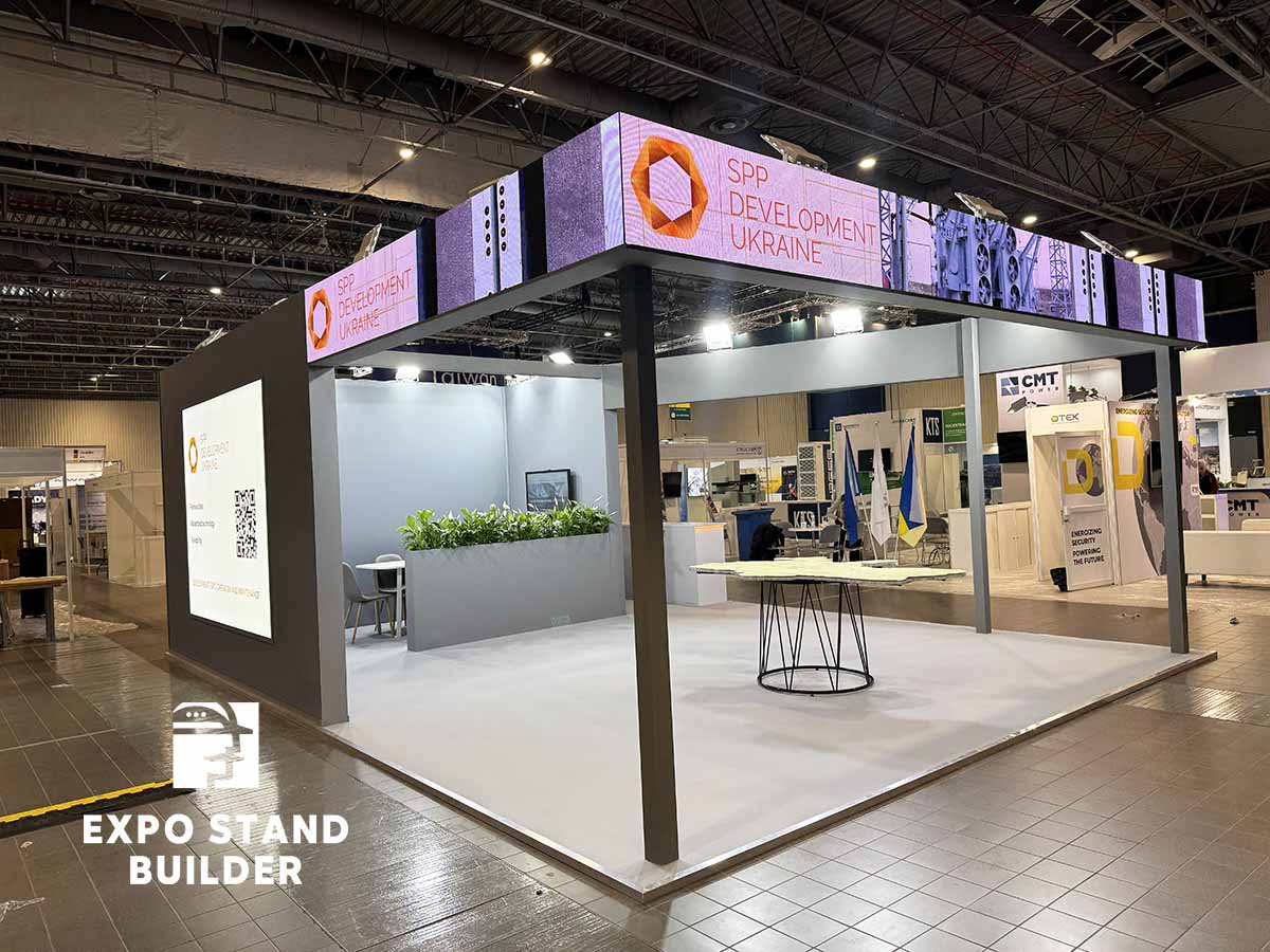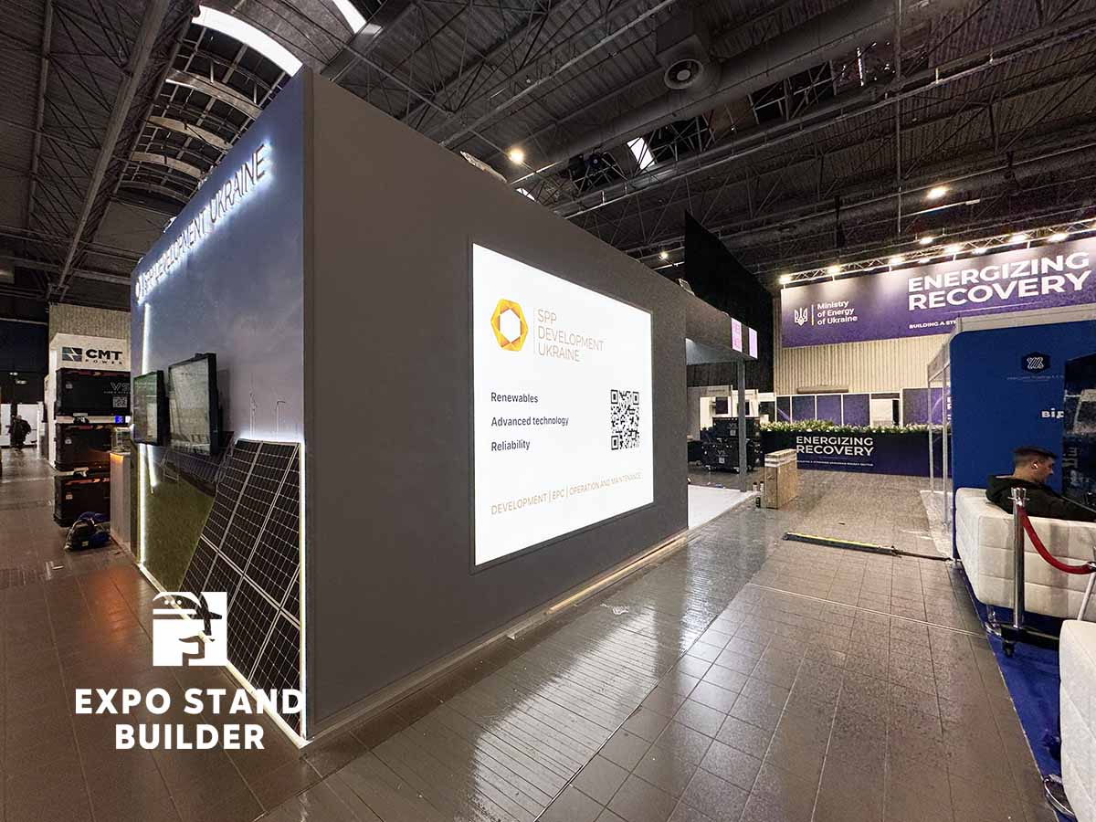 We present to your attention a custom exhibition stand with a total area of 48 square meters for SPP Development Ukraine at the Rebuild Ukraine exhibition, which took place in Warsaw, Poland. The stand was an open meeting area with a zone for VIP clients. We used LED screens around the perimeter of the stand, as well as lighting and interactive elements to visually distinguish the brand from its competitors. If you need to design and build an exhibition stand in Poland, contact our team for help!